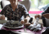 Ein älterer Mann mit weißem Haar und kariertem Hemd isst an einem Tisch und schaut nach rechts.